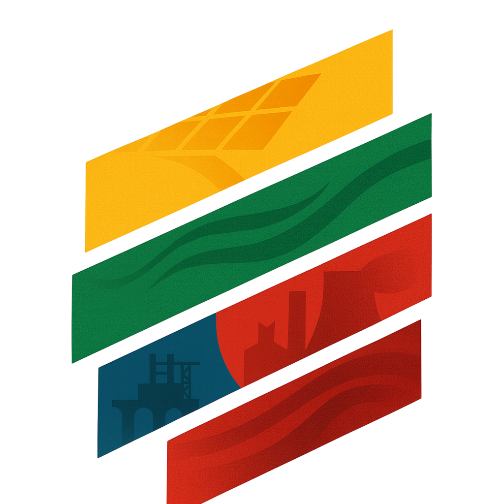Este ícone simboliza o planejamento urbano harmônico, onde o território, a cidade e o céu coexistem em equilíbrio. Três faixas horizontais representam terra, vida urbana e horizonte, atravessadas por linhas brancas que evocam ruas, fluxos e conexões humanas.