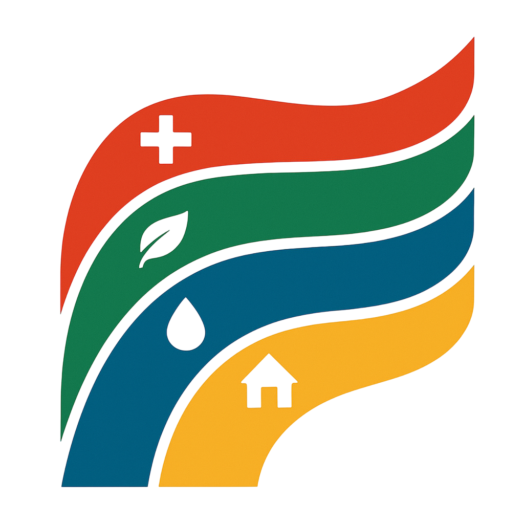 As quatro faixas coloridas representam saúde, alimentação, saneamento e moradia, guiadas por uma linha branca contínua que simboliza a governança pública. Um emblema que expressa o papel do Estado em dar direção e equilíbrio aos fluxos da vida social.